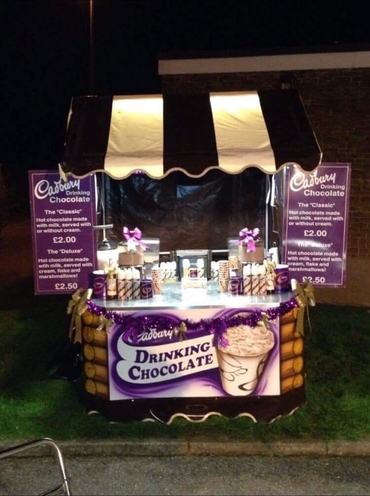 Steaming hot and topped with cream and marshmallows, Cadbury’s hot chocolate is what winter is all about. There’s nothing like cupping your cold hands around a hot chocolate on a chilly night, and nothing says chocolate quite like the Cadbury brand. Now you can bring the two together with this Cadbury branded professional hot chocolate stall, delivering delicious drinks for all your customers or guests. An essential addition to any outdoor festive event, this welcome bit of warmth is also great for fireworks displays, outdoor theatre productions and Christmas carol services. It’s the perfect complement to your other catering stalls, such as handmade gourmet burgers and authentic German sausages. The stall comes fully staffed with friendly choco-baristas who will create genuine Cadbury’s hot chocolate drinks using freshly steamed milk. There’s also an option for all the trimmings, including cream, flake and marshmallows. The cart can be set up almost anywhere and can be used as a complimentary refreshment stall, a paid service or a fundraiser for your charity cause. Whatever you hire it for, you can rest assured that all our catering equipment and staff come with full food hygiene certification to the very highest standards. To get your hands on a steaming mug of tasty hot chocolate, get in touch today for full details of our event catering services in Essex, Kent, London and nationwide.
